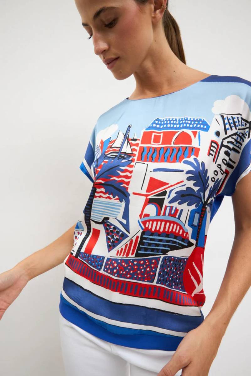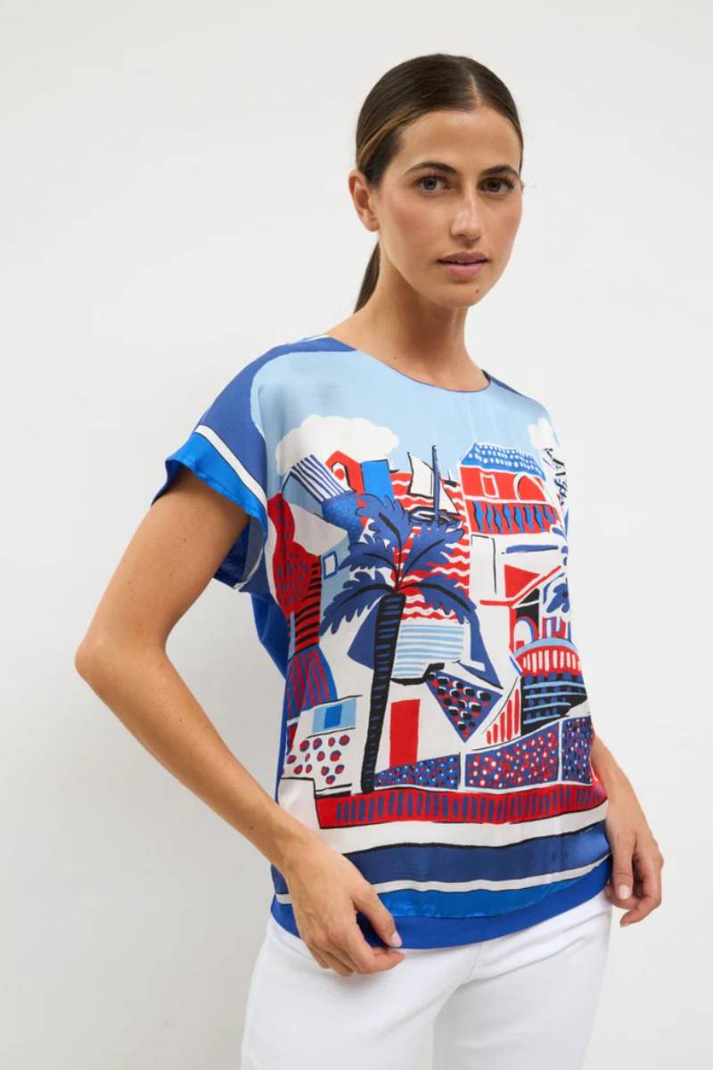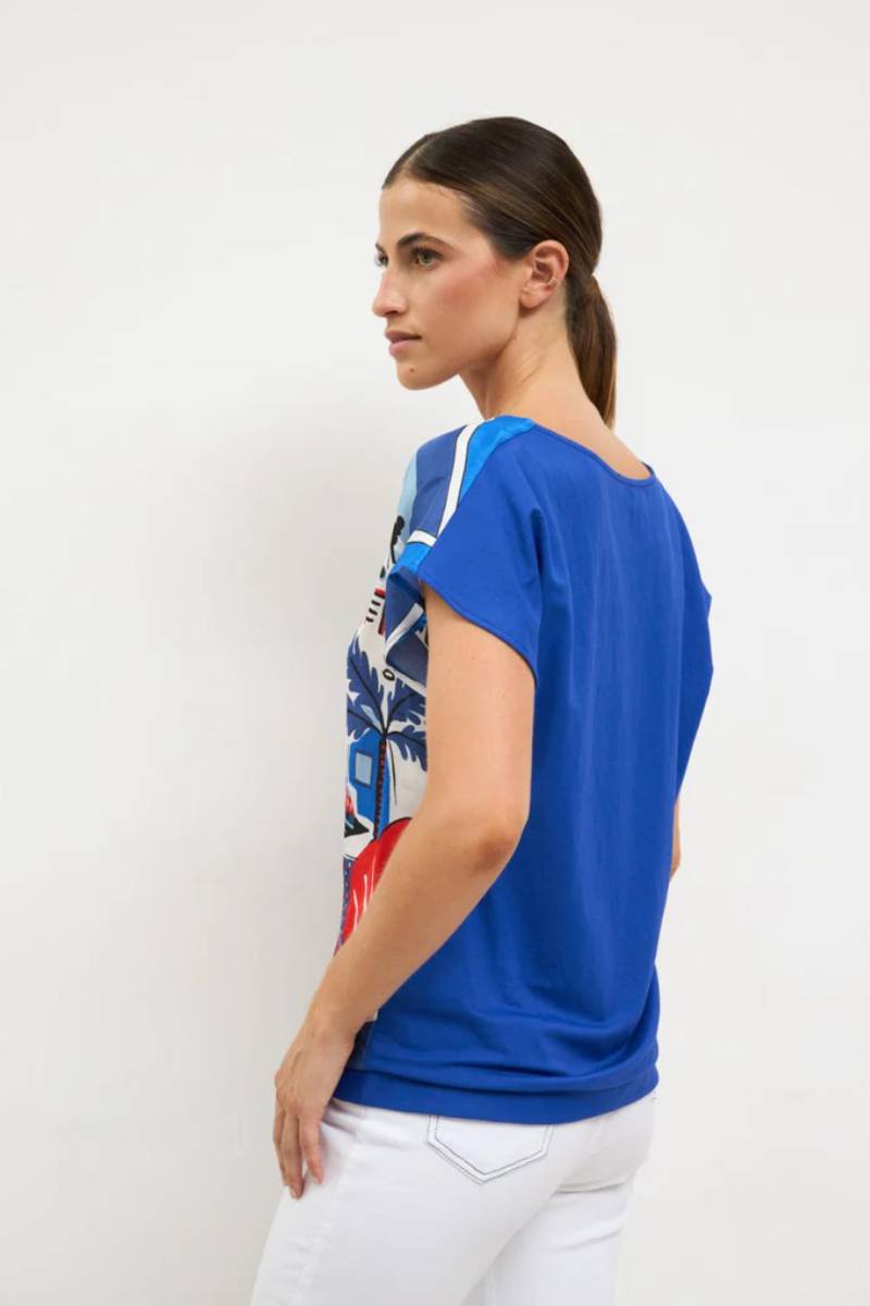 Μπλούζα με κοντό μανίκι. Στρογγυλή λαιμόκοψη με καλλιτεχνικό τύπωμα. Ίσια γραμμή. Ίσια γραμμή. Σχεδιασμένη και κατασκευασμένη στην Ισπανία. 75% βισκόζη 25% πολυαμίδιο