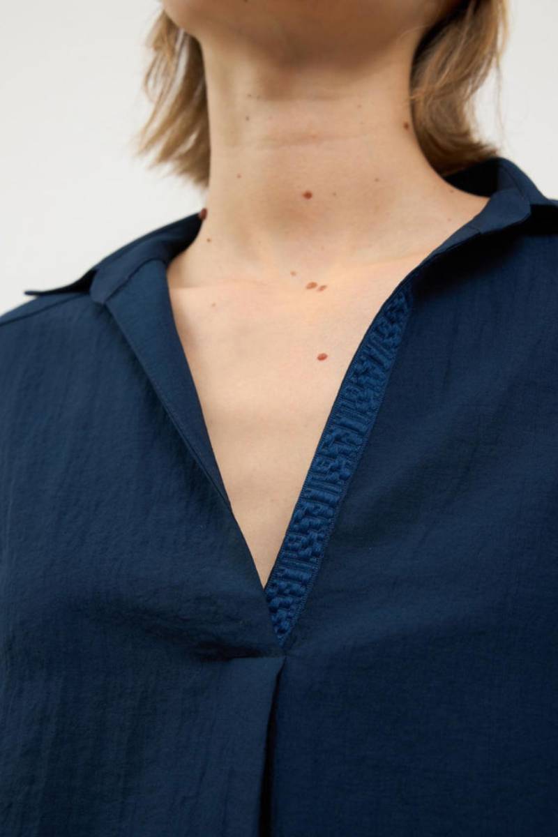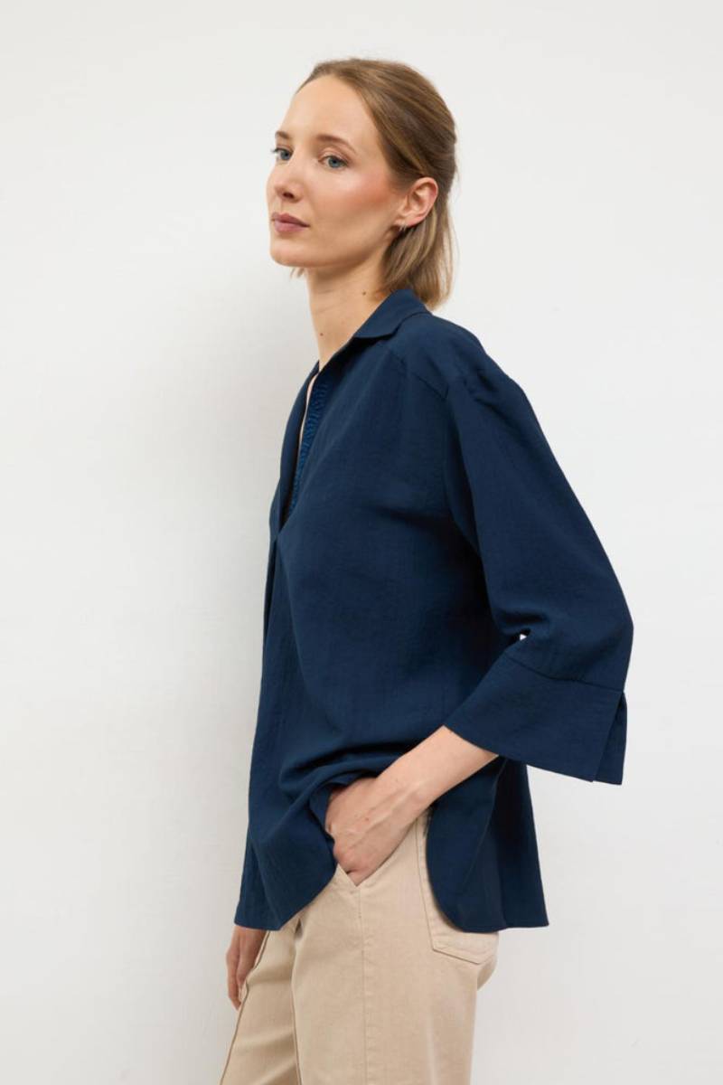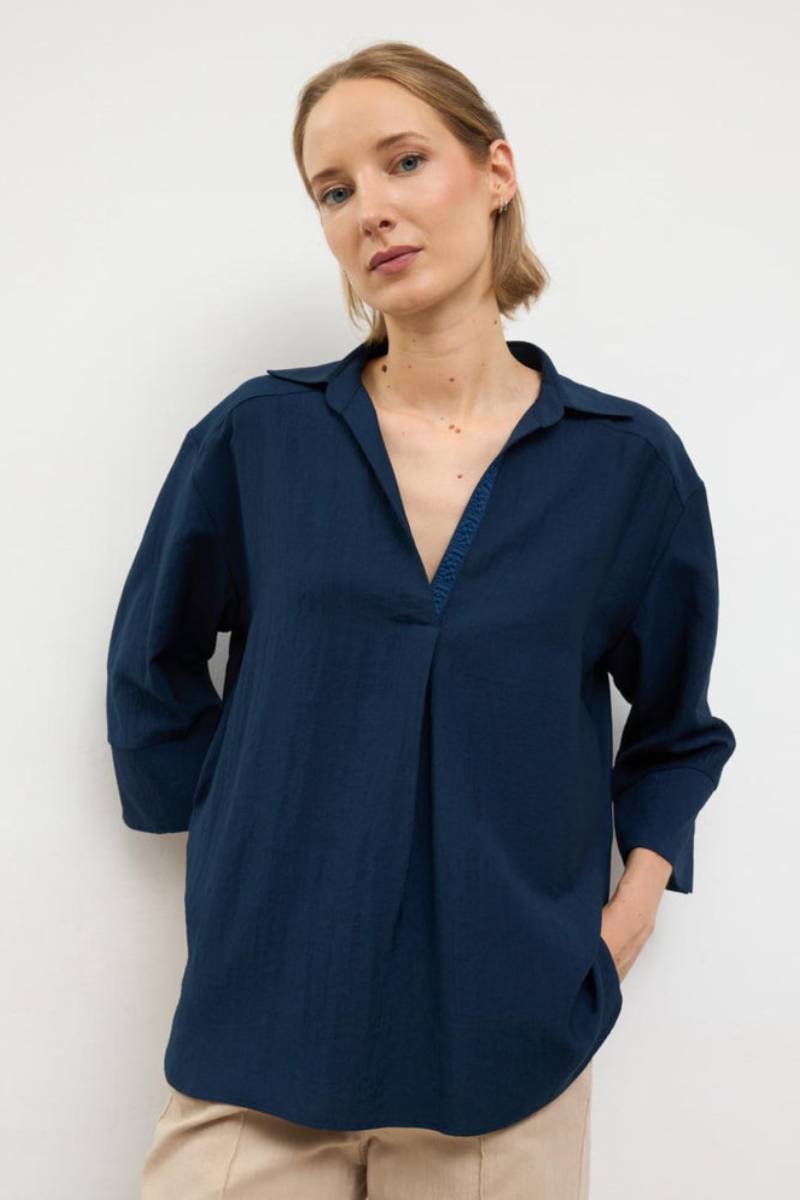 Μπλούζα με μανίκια τριών τετάρτων. Ανοιχτός γιακάς πουκαμίσου. Λεπτομέρεια με πιέτες μπροστά. V λαιμόκοψη. Ίσιο στρίφωμα. Σχεδιασμένο και κατασκευασμένο στην Ισπανία.