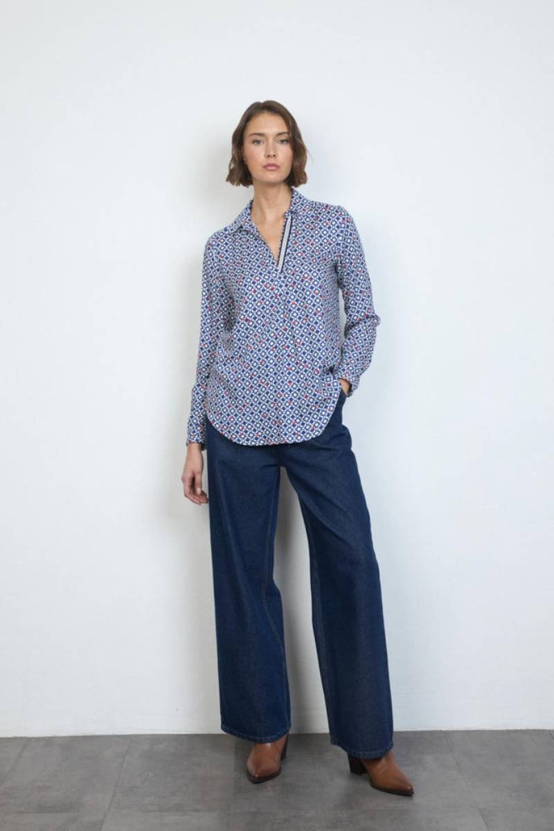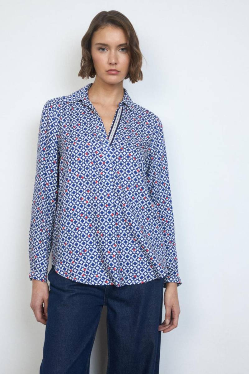 Μπλούζα με γεωμετρικά σχέδια. Γιακάς πουκαμίσου με V ντεκολτέ και τυπωμένο τελείωμα.