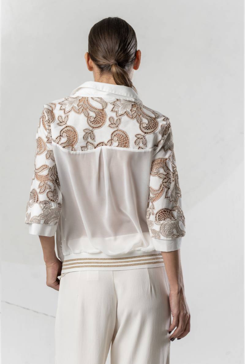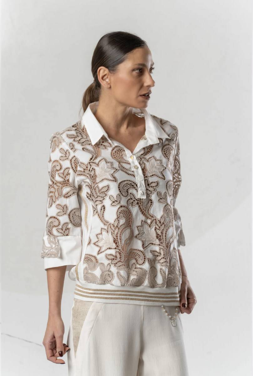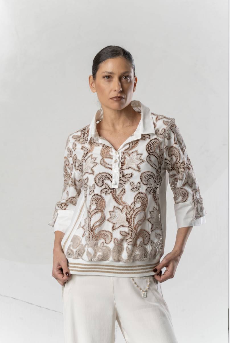 Περιγραφή – Λευκή και μπεζ μπλούζα – Διαφανής φλοράλ δαντέλα – Λευκή πλάτη με ζορζέτα – Μανίκια 3/4 – Κλασικός γιακάς – Κλείσιμο με κουμπιά μπροστά – Ρυθμιζόμενη λαιμόκοψη – Ελαστικά πλαϊνά σχισίματα – Ριγέ ελαστικό πλεκτό στρίφωμα – Απαλή μπλούζα – Διαχρονική εμφάνιση – Εκφράστε την προσωπικότητά σας οποιαδήποτε στιγμή με την Elisa Cavaletti – Κατασκευασμένο στην Ιταλία – Κανονική εφαρμογή – Μετρήσεις μοντέλου: ύψος 181 εκ., στήθος 90 εκ., μέση 68 εκ., γοφοί 95 εκ. – Το μοντέλο έχει ύψος 181 εκ. και φοράει μέγεθος S