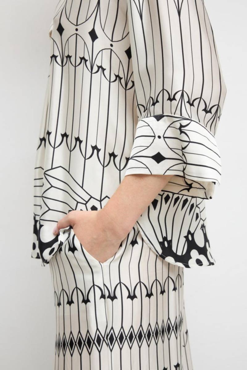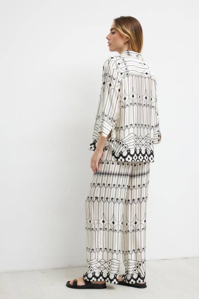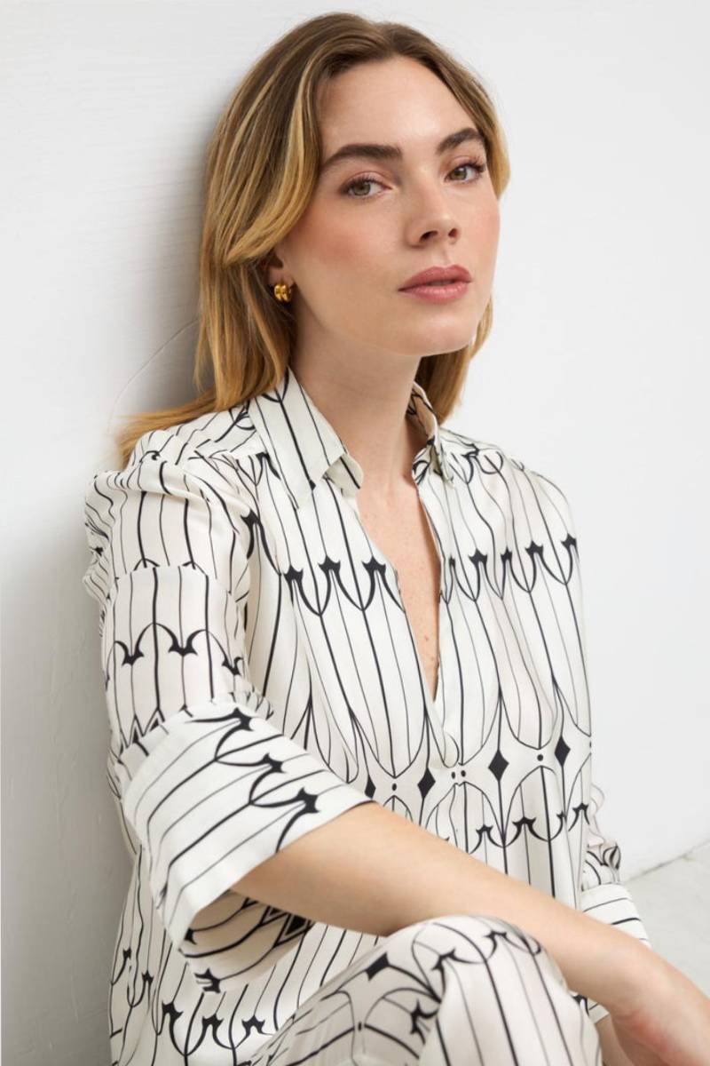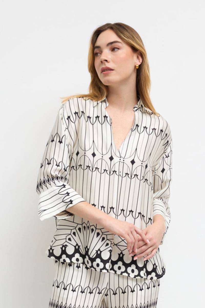 Ριχτό πουκάμισο με μανίκια τριών τετάρτων. Γιακάς με V λαιμόκοψη. Γεωμετρικό ασπρόμαυρο τύπωμα. Ίσιο στρίφωμα. Σχεδιασμένο και κατασκευασμένο στην Ισπανία.