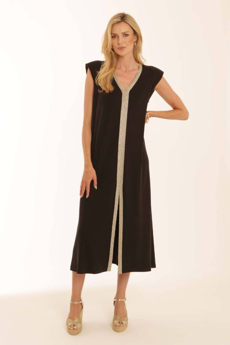 Απλό αλλά κομψό φόρεμα μίντι σε μαύρο χρώμα με χρυσή λεπτομέρεια μπροστά και ασορτί χρυσή ζώνη. Διαθέτει σκίσιμο μπροστά. Ένα ευέλικτο φόρεμα που μπορεί εύκολα να μεταβεί από μέρα σε νύχτα. Τέλειο φόρεμα για καλοκαιρινές διακοπές.