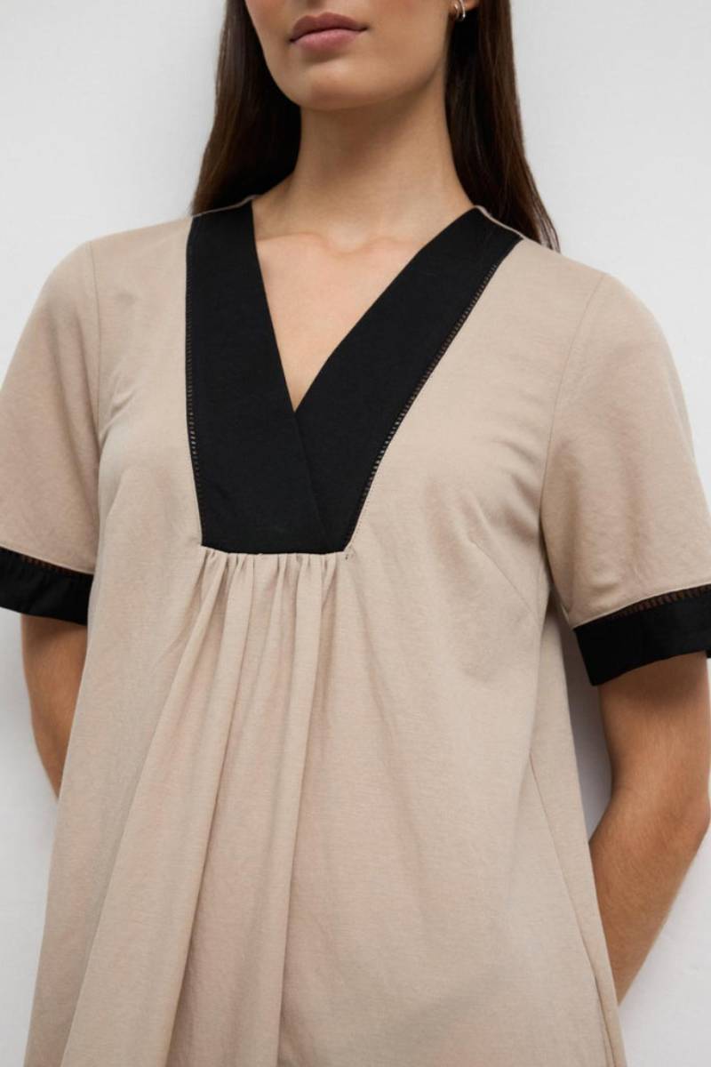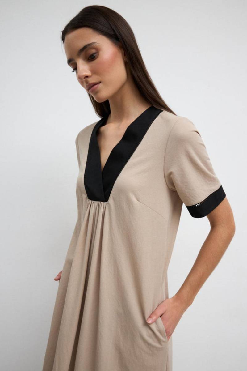 Μακρύ φόρεμα με κοντά μανίκια. V λαιμόκοψη με λεπτομέρεια σε χρωματικό μπλοκ σε αντίθεση στη λαιμόκοψη και στις μανσέτες. Γραμμή Α με ελαφριά ριχτή γραμμή στο στήθος. Ίσιο στρίφωμα.