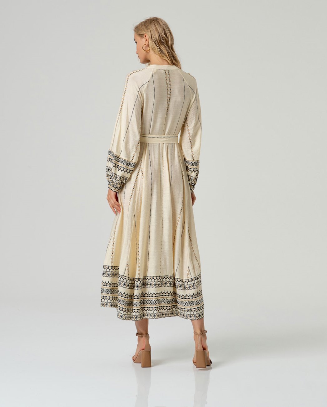 φόρεμα με V λαιμόκοψη και μακριά μανίκια με λάστιχο στη μανσέτα. Λεπτομέρεια με κάθετο γεωμετρικό κέντημα και κεντημένη ταινία στις μανσέτες και το στρίφωμα, με κλείσιμο με κουμπιά μπροστά και ζώνη από το ίδιο ύφασμα. Κατασκευασμένο από μείγμα βισκόζης και πολυαμιδίου. Σχεδιασμένο. Κέντημα