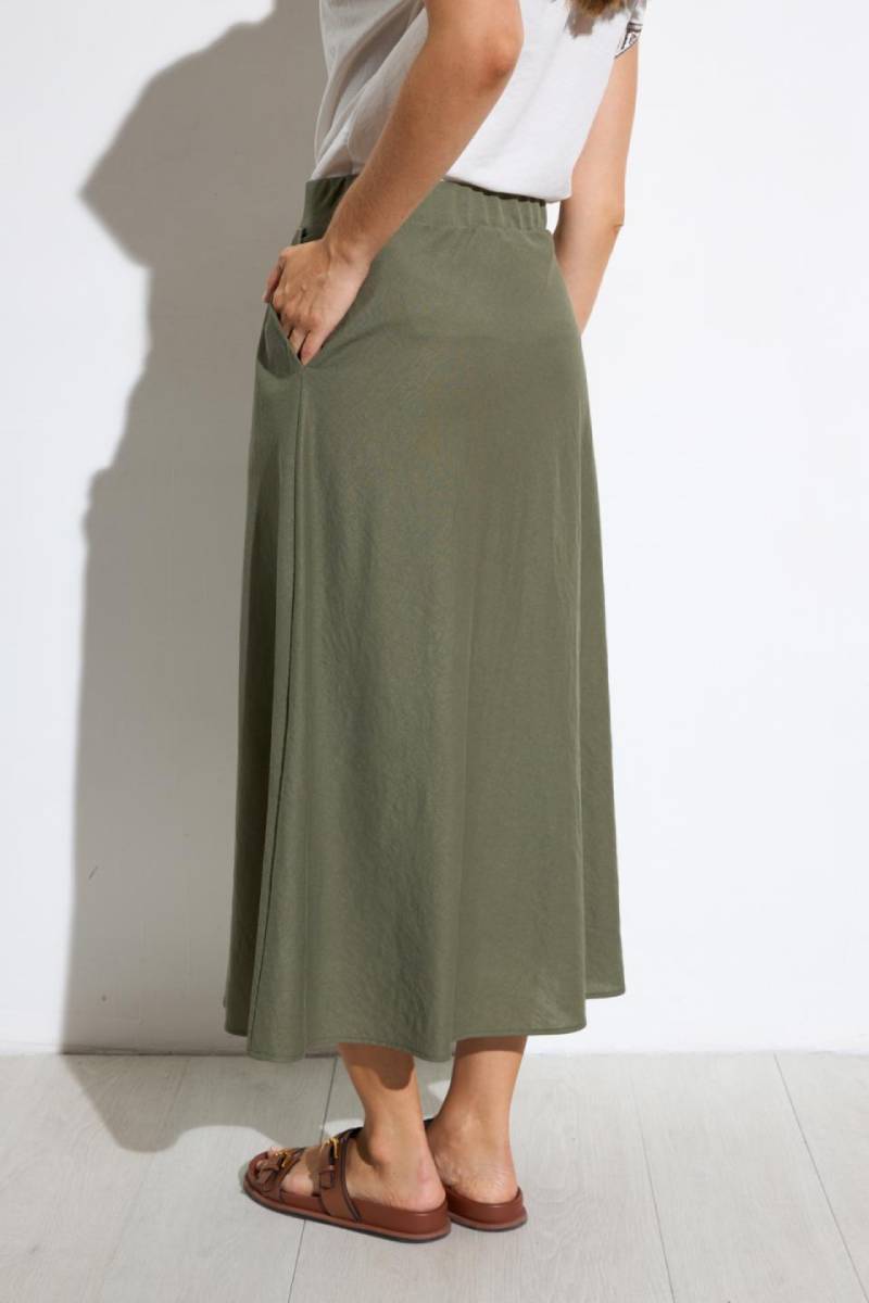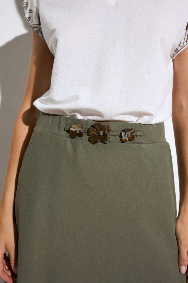 Μονόχρωμη μίντι φούστα. Ψηλόμεση με φλοράλ απλικέ. Ελαστική ζώνη. Απλό φαρδύ στρίφωμα.