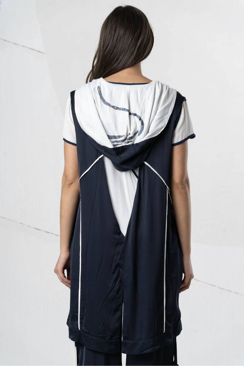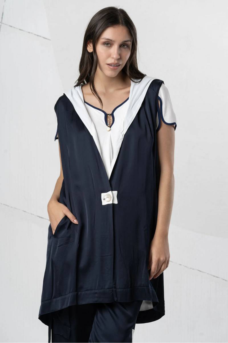Γιλέκο με σατέν εφέ σε μπλε χρώμα με λευκή εσωτερική επένδυση.