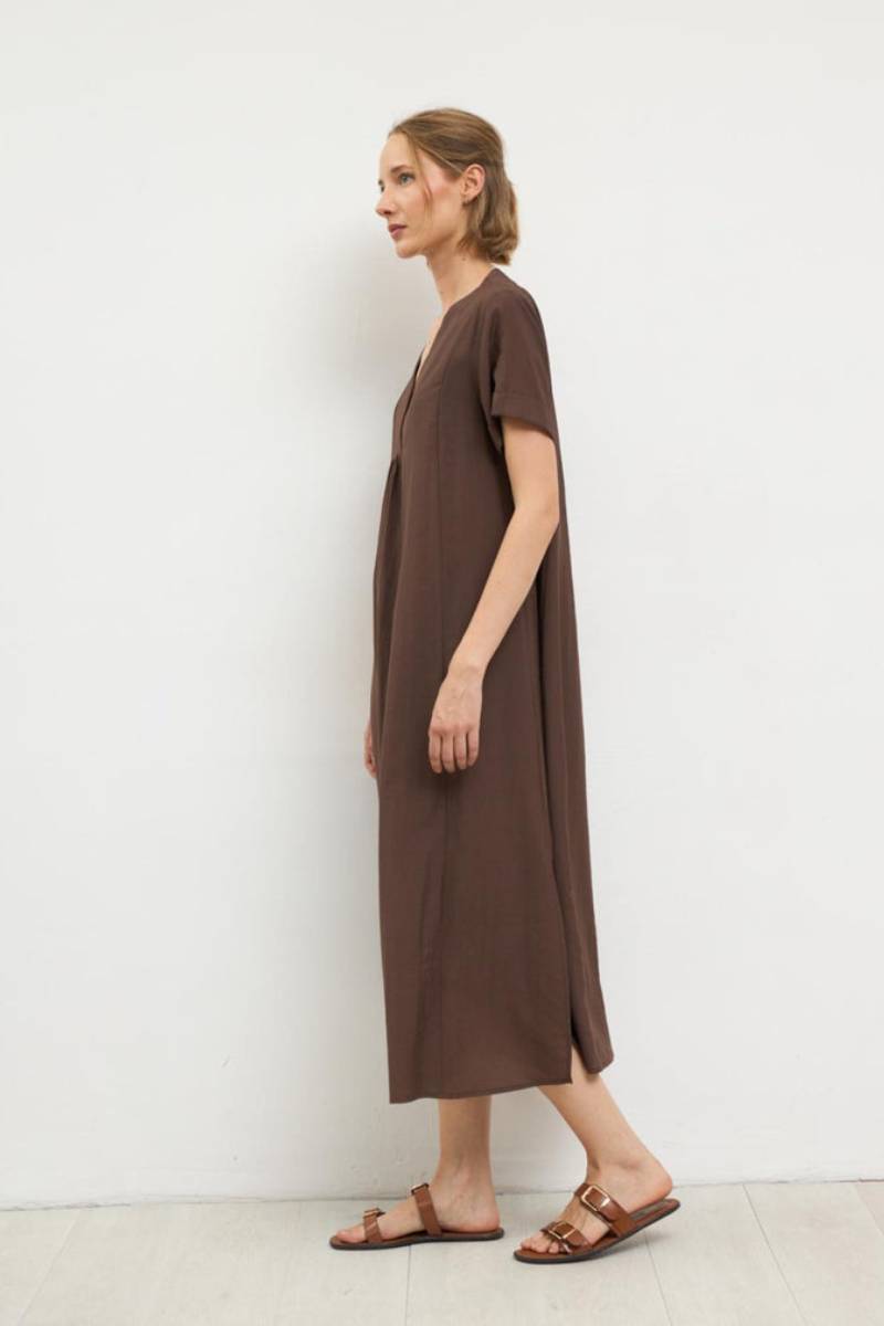 Μακρύ φόρεμα με κοντά μανίκια σε ιαπωνικό στιλ. Σταυρωτή λαιμόκοψη V με σούρες στο στήθος. Γραμμή Α. Ίσιο στρίφωμα με πλαϊνά σχισίματα.