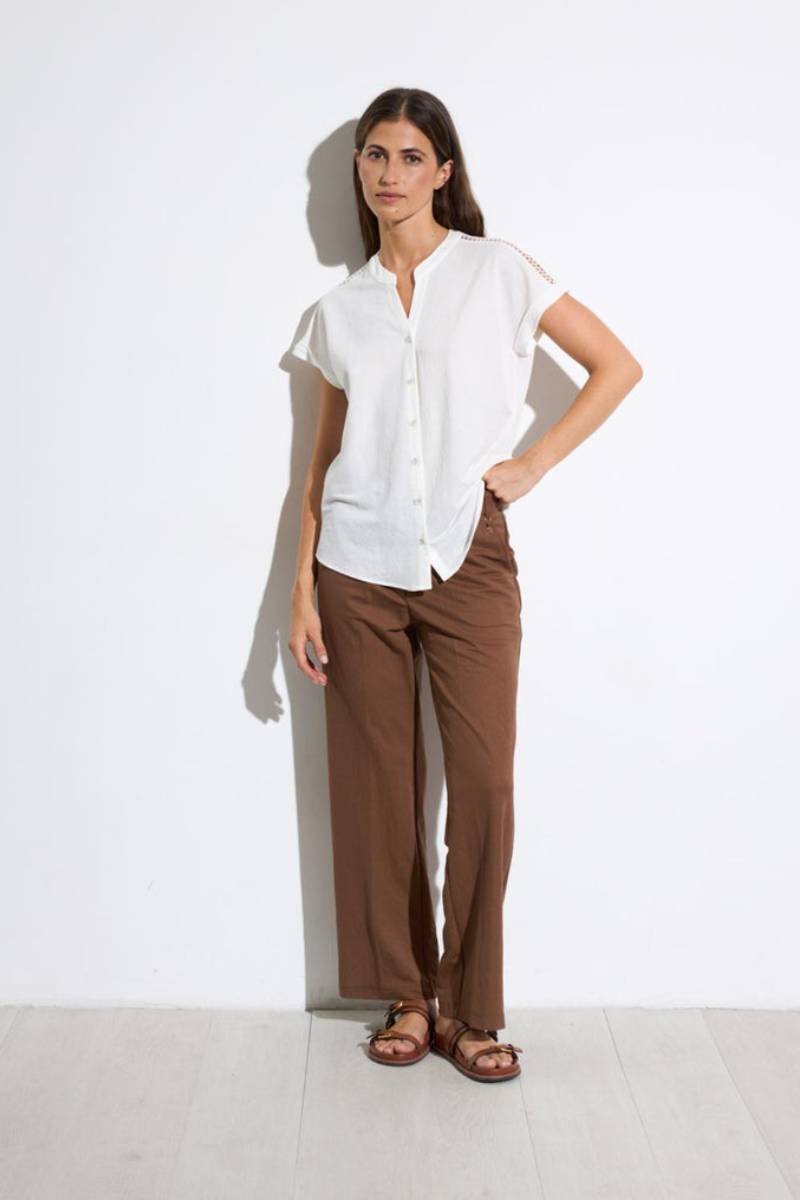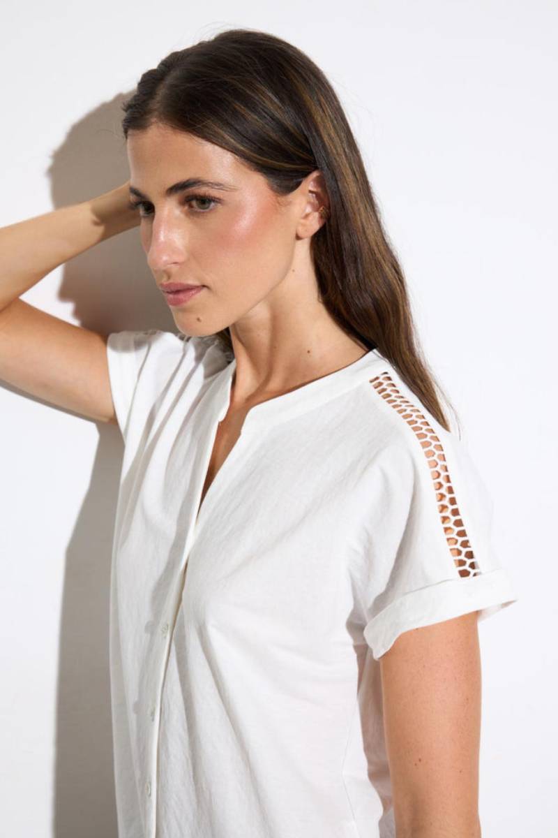 Μπλούζα με κοντά μανίκια σε ιαπωνικό στιλ. Γιακάς σε μανταρινί απόχρωση. Ανοιχτές λεπτομέρειες στους ώμους. Κλείσιμο με κουμπιά μπροστά. Στρογγυλεμένο στρίφωμα.