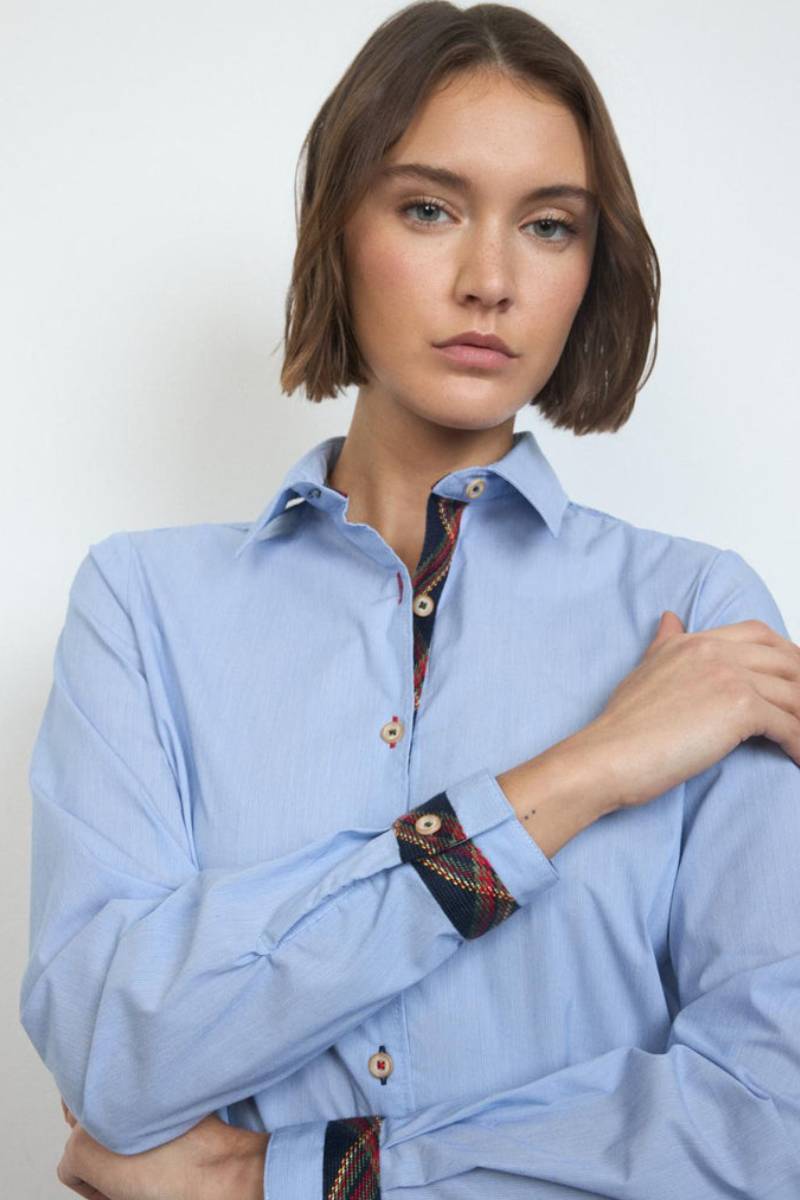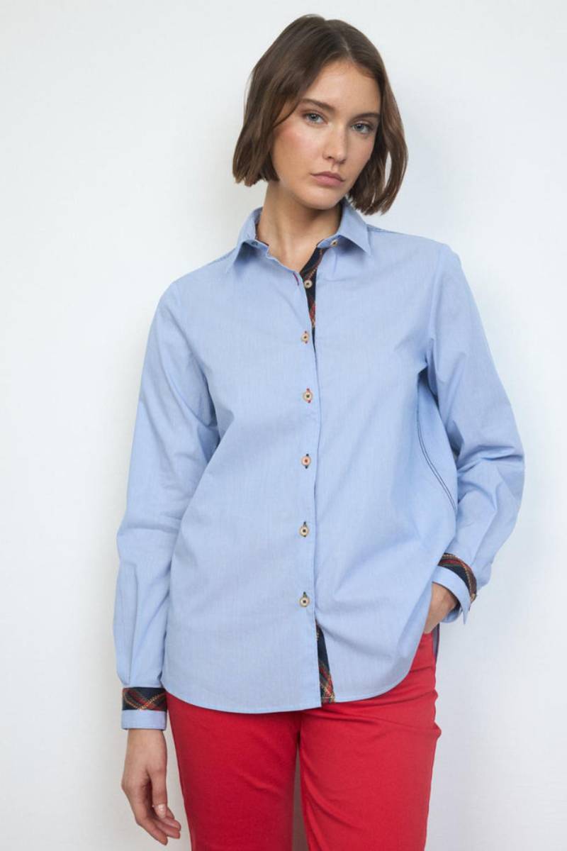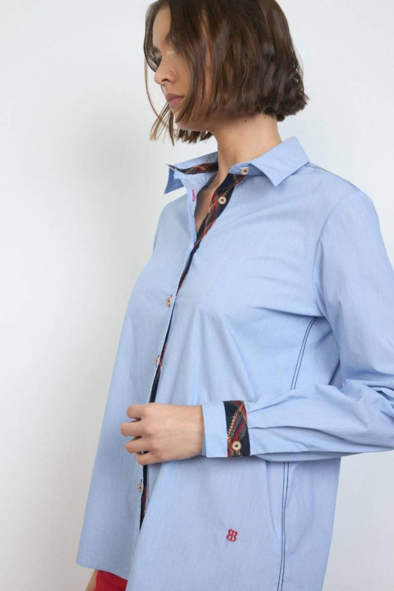 Ριγέ πουκάμισο. Ίσιο σχέδιο. Γιακάς πουκαμίσου. Κλείσιμο με κουμπιά μπροστά και εσωτερική λεπτομέρεια κορδέλας σε αντίθεση. Μακριά μανίκια με μανσέτες με κουμπιά και ασορτί λεπτομέρεια κορδέλας. Στρογγυλεμένο στρίφωμα.