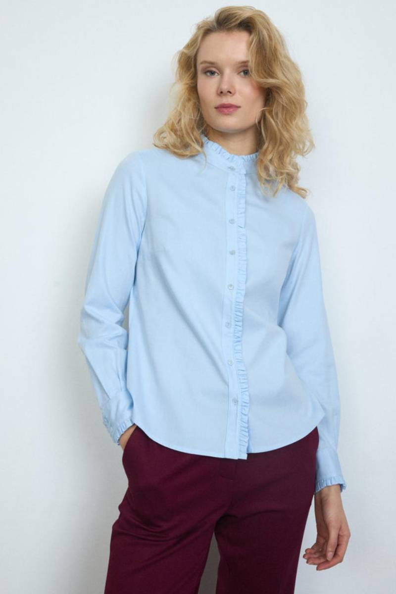 Μονόχρωμο πουκάμισο από ποπλίνα. Στενή εφαρμογή. Στρογγυλή λαιμόκοψη με βολάν. Ασορτί κλείσιμο με κουμπιά μπροστά και ασορτί βολάν. Μακριά μανίκια με μανσέτες με κουμπιά και βολάν. Στρογγυλεμένο στρίφωμα.